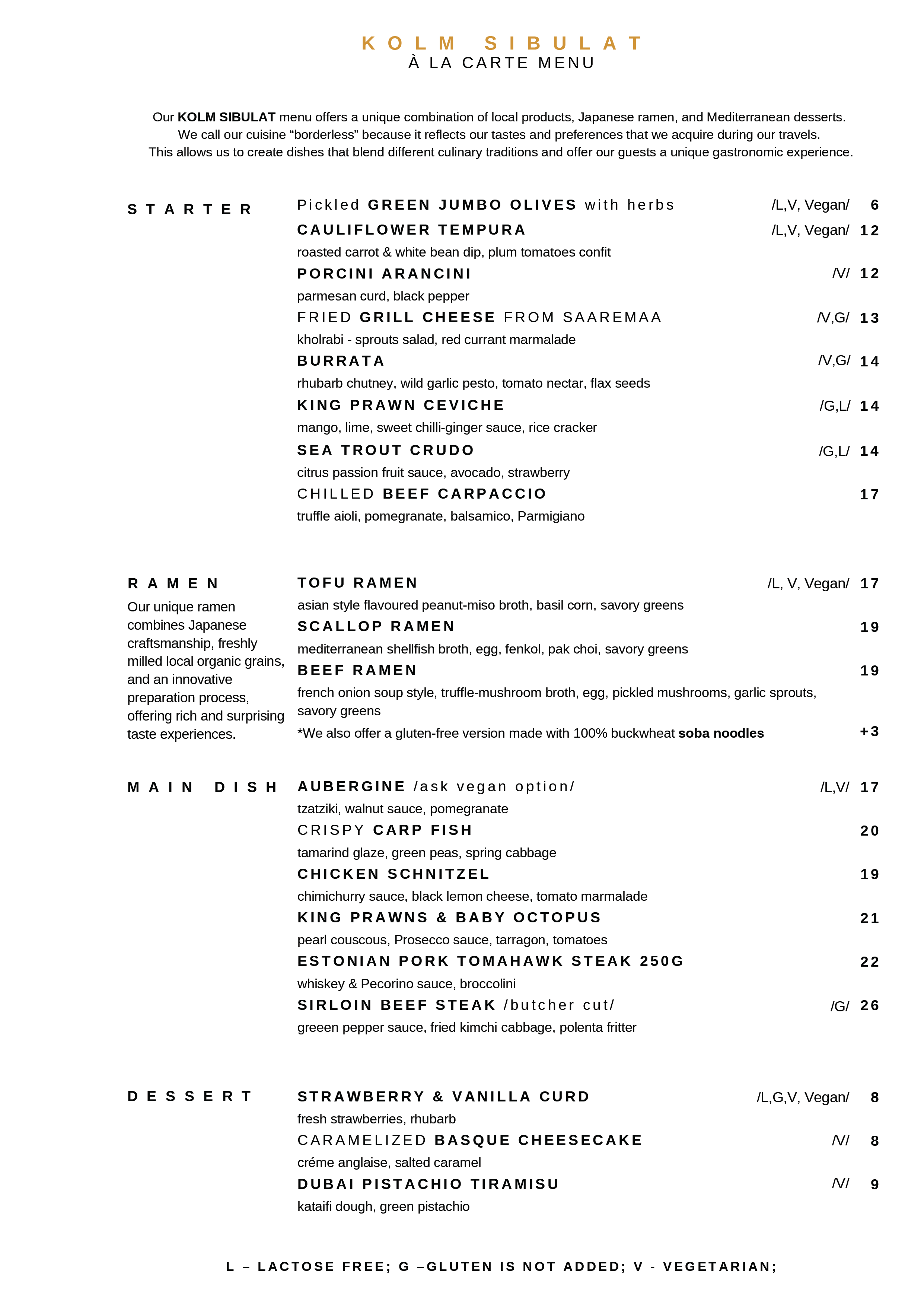 A LA CARTE MENÜÜ E - R 11.30 - 23.00, L 13.00 - 23.00